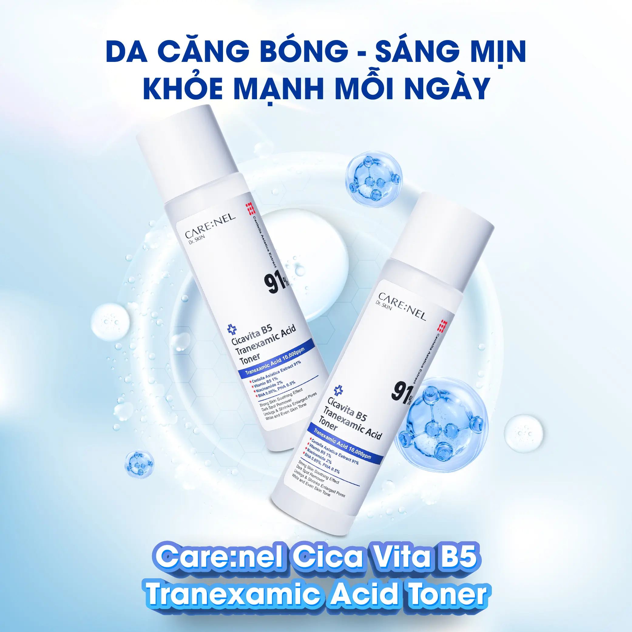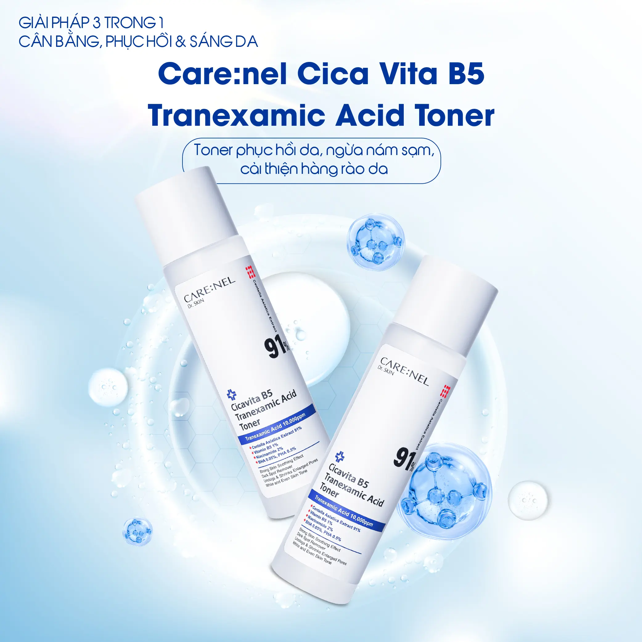 Carenel Cica Vita B5 Tranexamic Acid Toner là nước cân bằng phục hồi da đa tác dụng, kết hợp Vitamin B5, Cica (rau má) và Tranexamic Acid – bộ ba hoạt chất vàng giúp làm dịu, phục hồi, dưỡng ẩm và cải thiện sắc tố da.