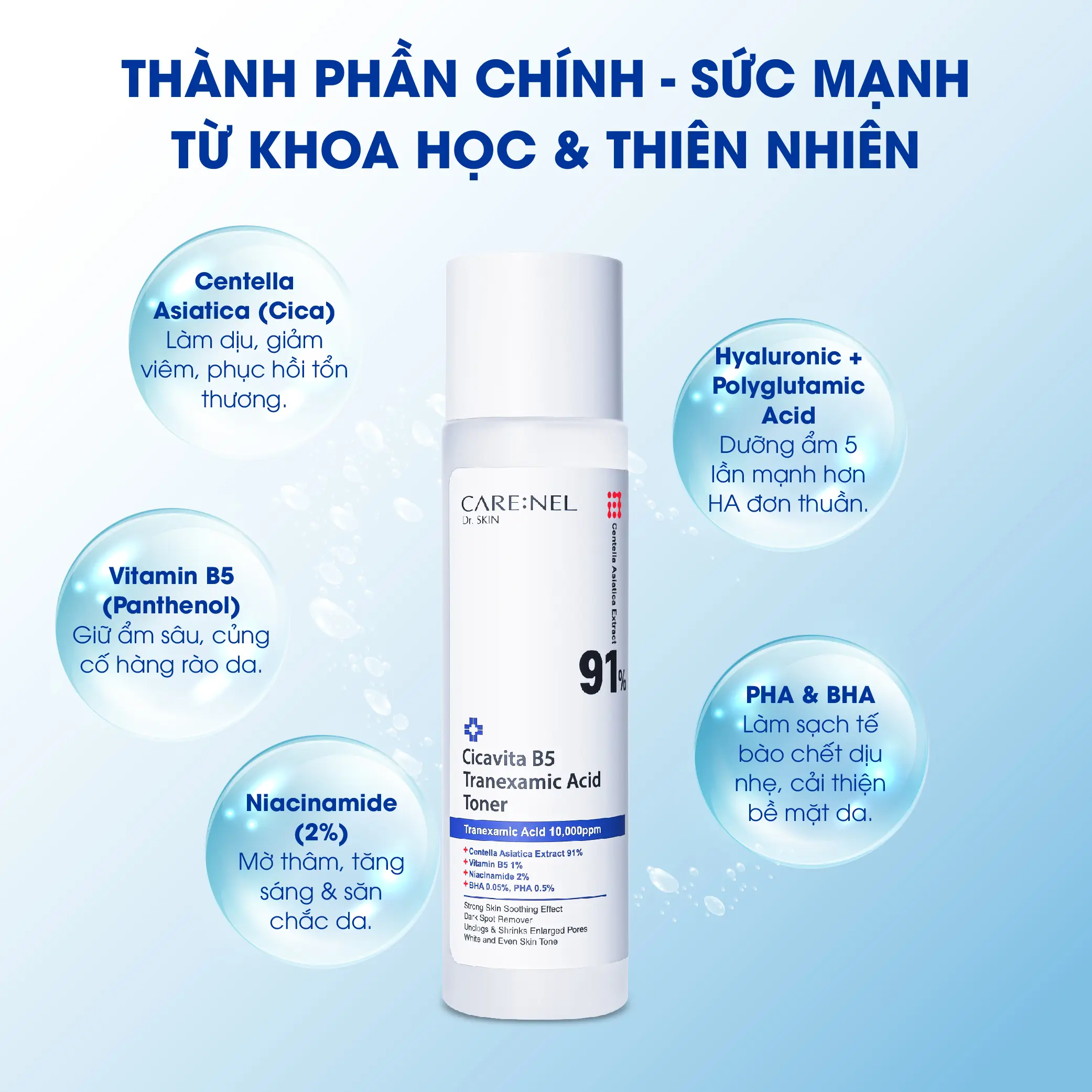 - Vitamin B5 (Panthenol) Giữ ẩm sâu, củng cố hàng rào bảo vệ da.